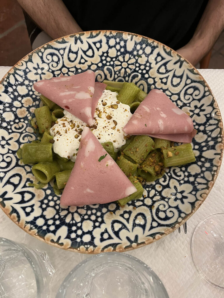 モルタデッラの乗ったペストのパスタ。