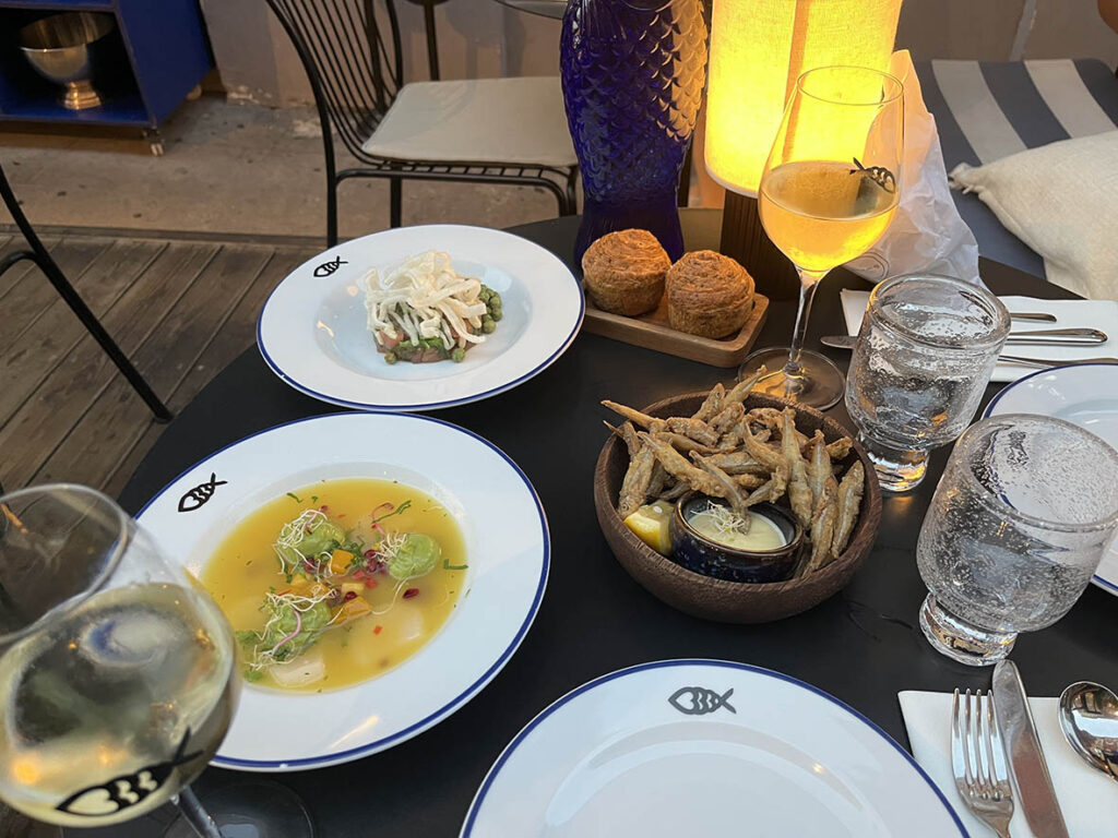 小魚のフライ、マグロのタルタル、ホタテのセビーチェを注文し、ロゼをちびちび。