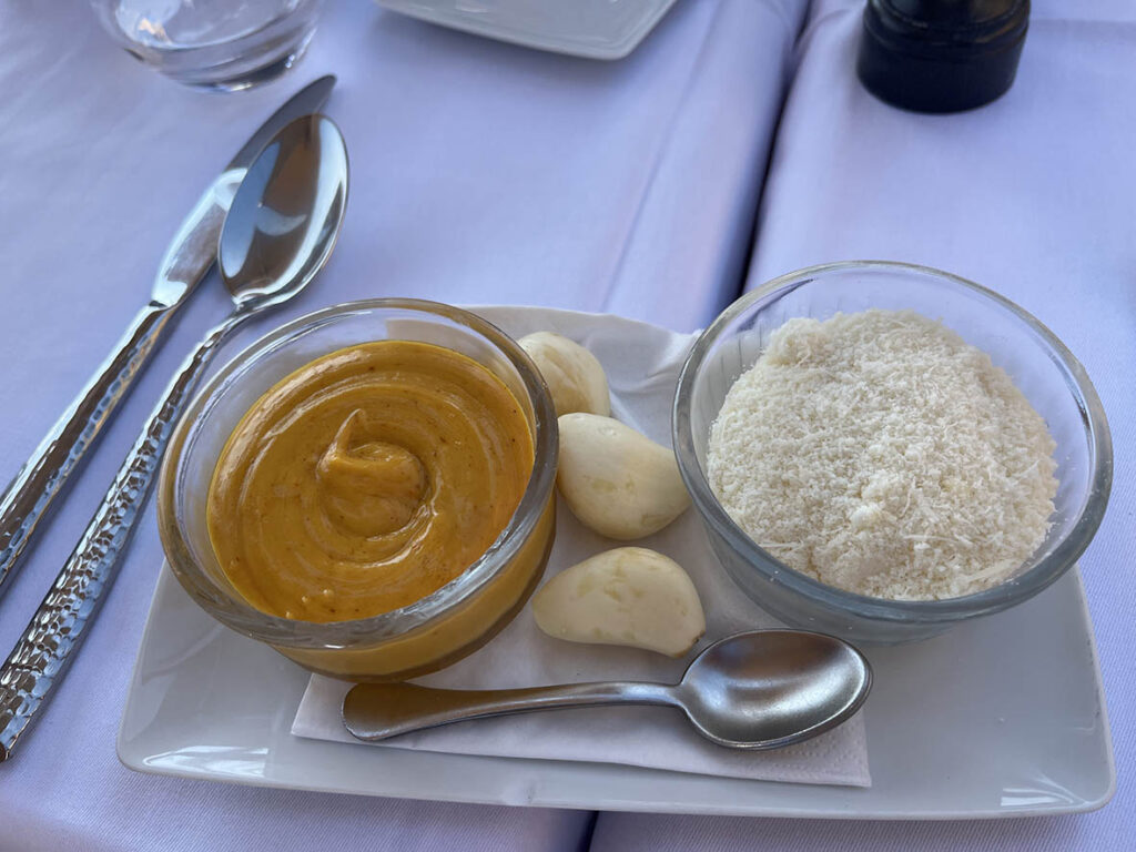 魚のスープ。ルイユを入れて食す。ニンニクはパンにぐりぐりと擦り付ける。