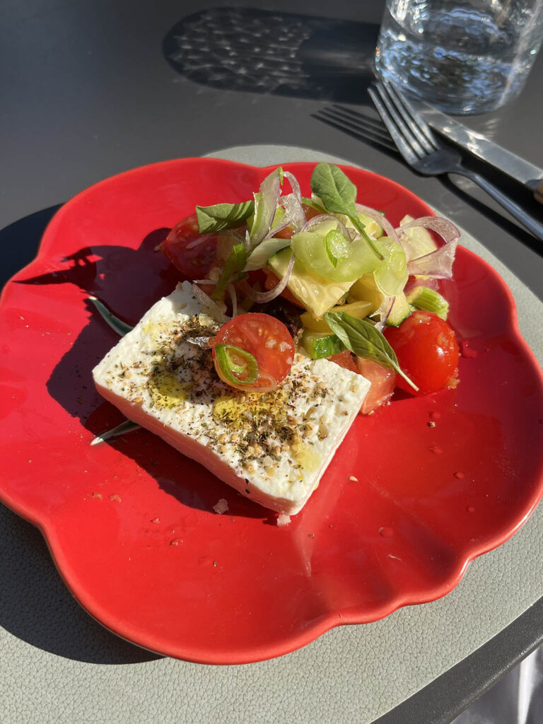 グリークサラダのフェタチーズにも玉ねぎとネギが!ダブルじゃん。ちょっとこのシェフ、私の中で敵認定。